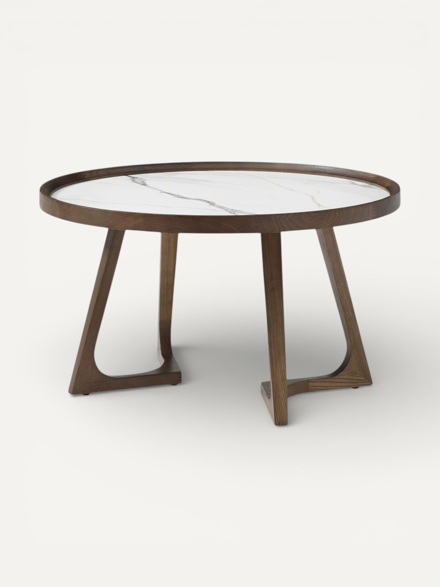 Текстура дерева приятно гармонирует с гладкостью керамической столешницы светлого цвета, а форма изящных ножек делает стол невероятно устойчивым.