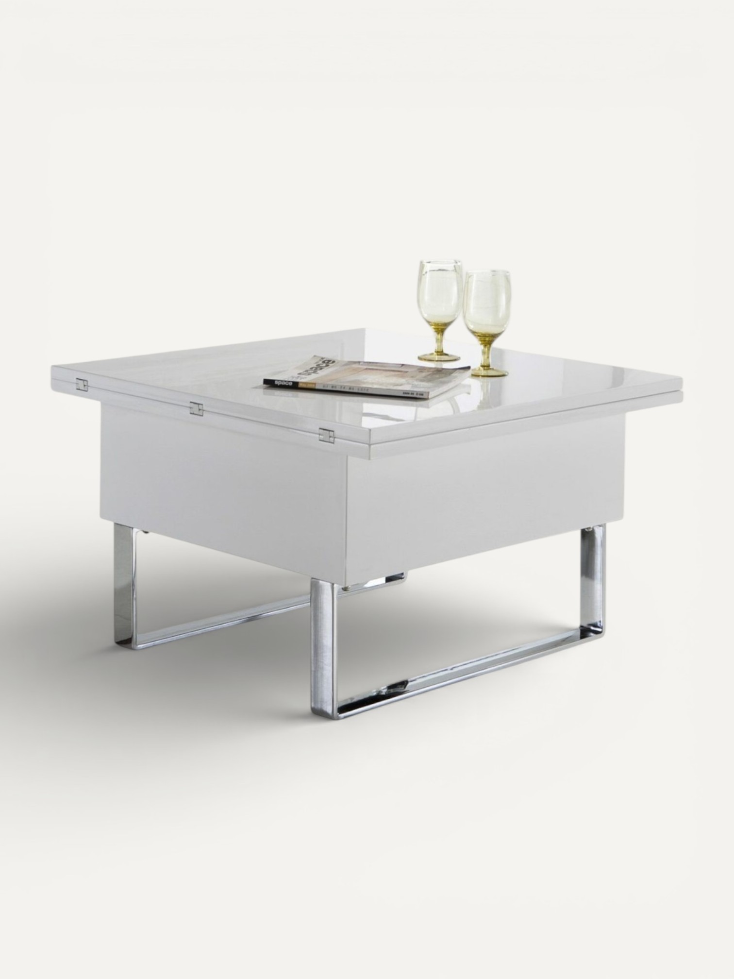 Изготовленный из МДФ, покрытого лаком, с хромированными металлическими деталями, он сочетает в себе стиль и практичность.