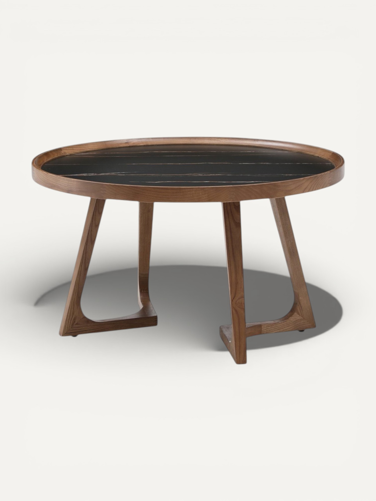 Текстура дерева приятно гармонирует с гладкостью керамической столешницы темного цвета, а форма изящных ножек делает стол невероятно устойчивым.