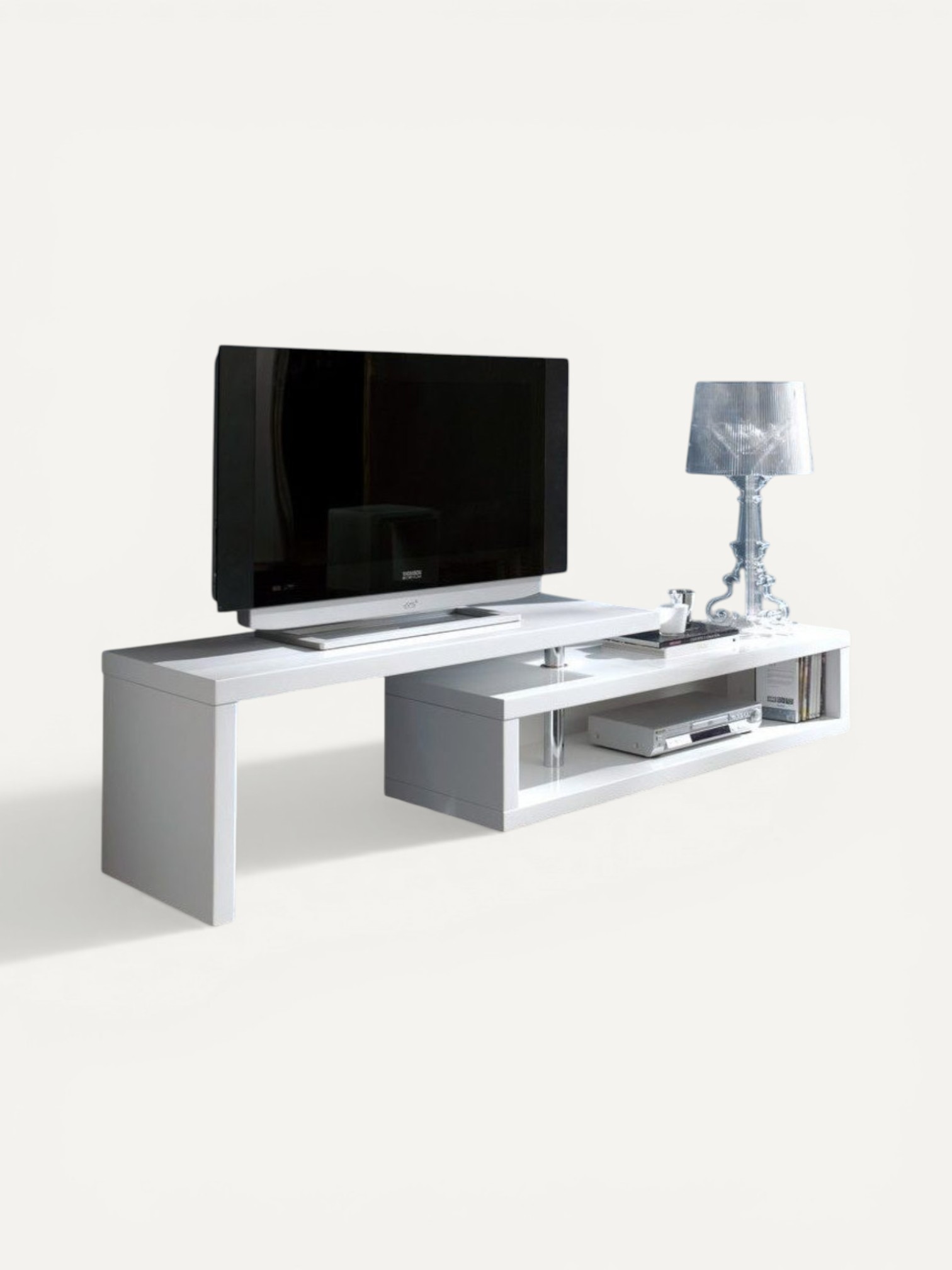 Тумба под телевизор Dupen выполнена в белом глянцевом цвете, что придает ей элегантный и современный вид. Она хорошо сочетается со всеми типами современных телевизоров и позволяет эффективно использовать пространство.