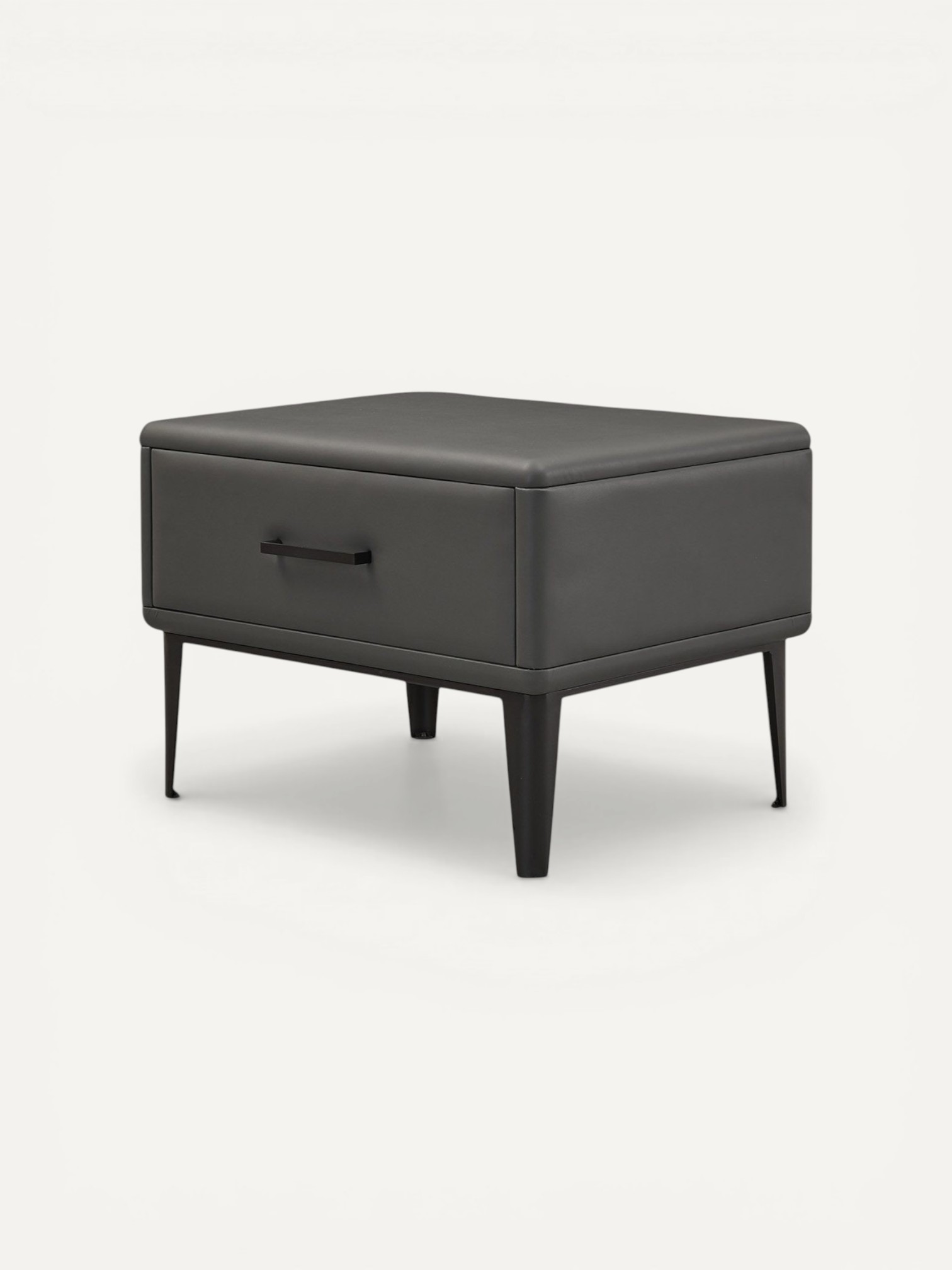 Ножки тумбочки выполнены из металла, что добавляет не только крепости, но и современного стиля. Материал обивки представлен высококачественной экокожей, что обеспечивает эстетичный внешний вид и легкий уход.