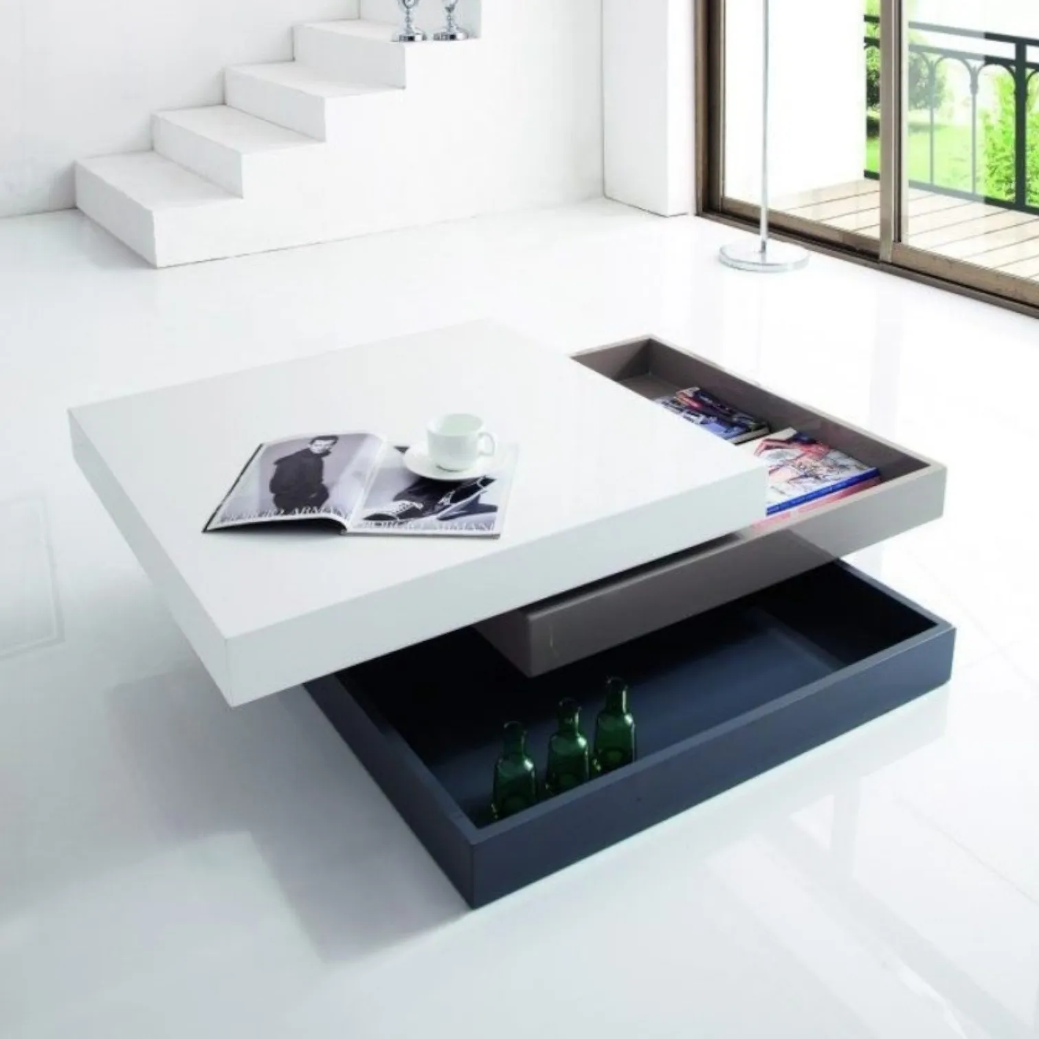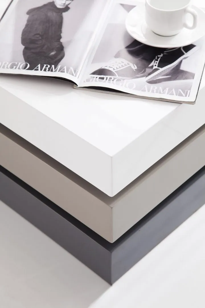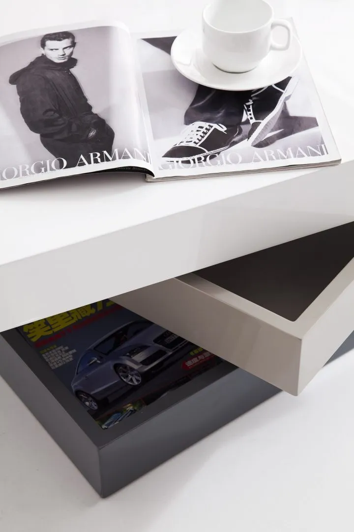 Журнальный столик Splendore в белом цвете представляет собой настоящий трансформер, состоящий из трех разноцветных секций, и создает неизгладимое впечатление своим дизайном.