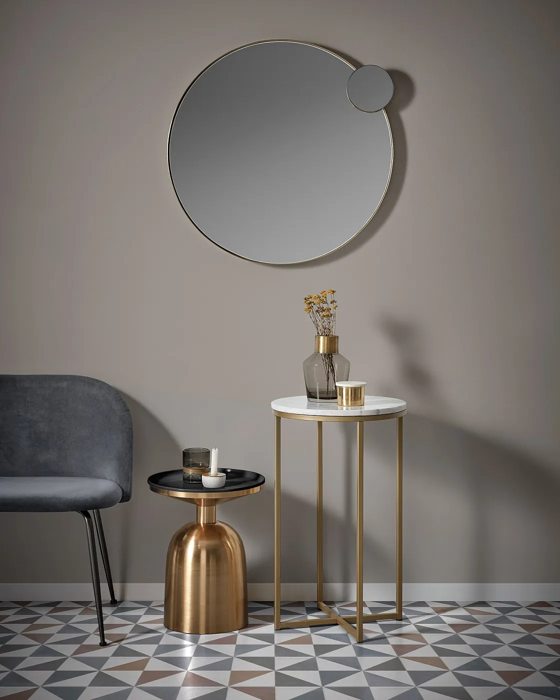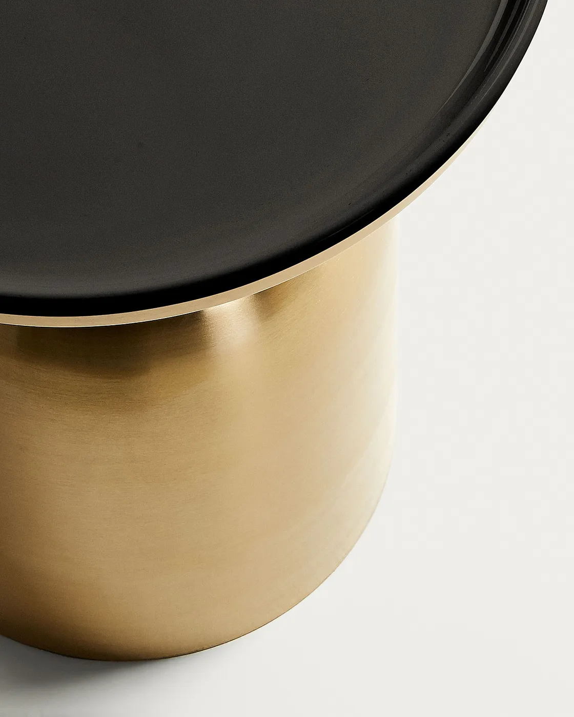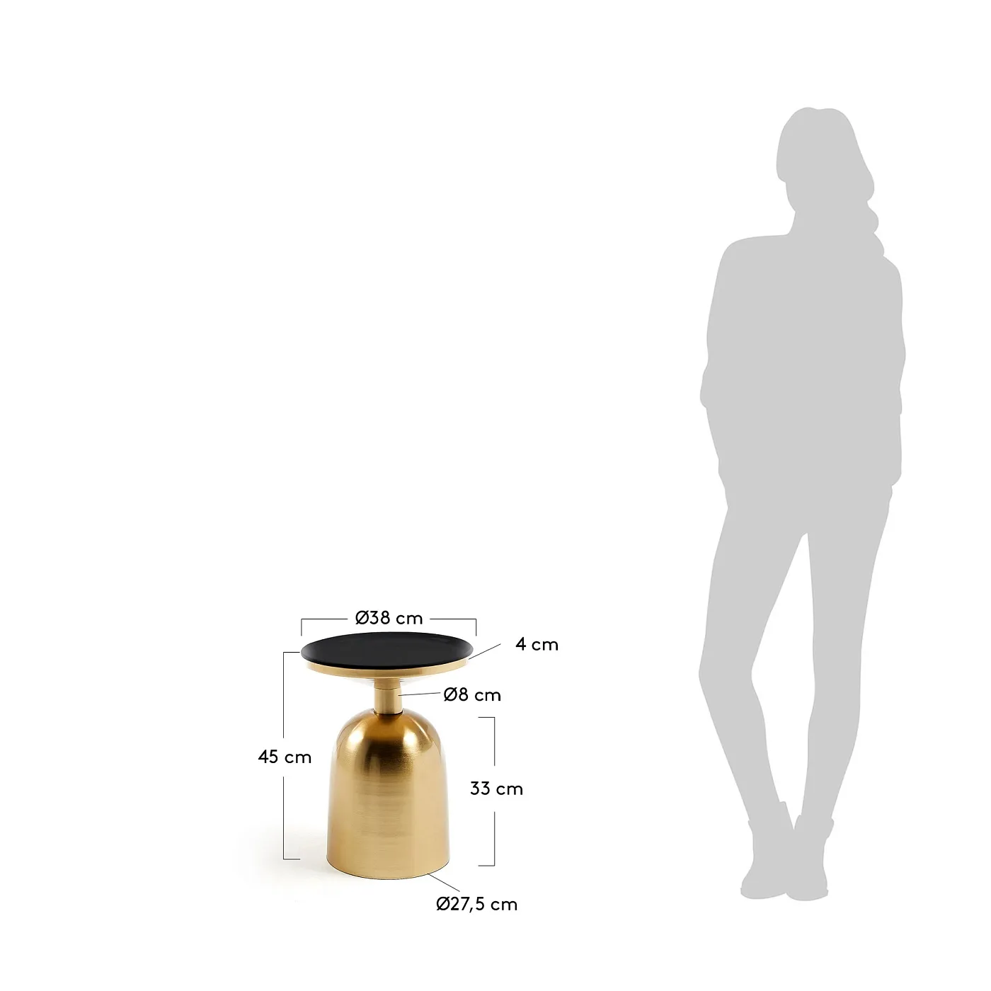 Столик приставной Physic от фабрики La Forma – эксклюзивный дизайн будет всегда рядом. Приставной столик Physic будоражит воображение своей оригинальной формой. Словно перевернутый бокал, он демонстрирует свои эффектные позолоченные боковины. Черная столешница – продуманный дизайнерский ход, чтобы добавить яркости и контраста. Столик полностью выполнен из металла. Стойка имеет гальваническое латунное покрытие, а столешница высотой 4 см покрыта черной глянцевой краской. Диаметр стойки в основании составляет 27,5 см, что обеспечивает хорошую устойчивость на любом напольном покрытии. А для его защиты от повреждений, предусмотрены войлочные подушки. Труба, соединяющая цилиндрическую часть со столешницей, имеет диаметр 8 см. Максимально допустимая нагрузка на столик не должна превышать 5 кг. Размеры: ширина – 38 см, высота – 45 см. Вес – 4,9 см. Сборка не требуется.