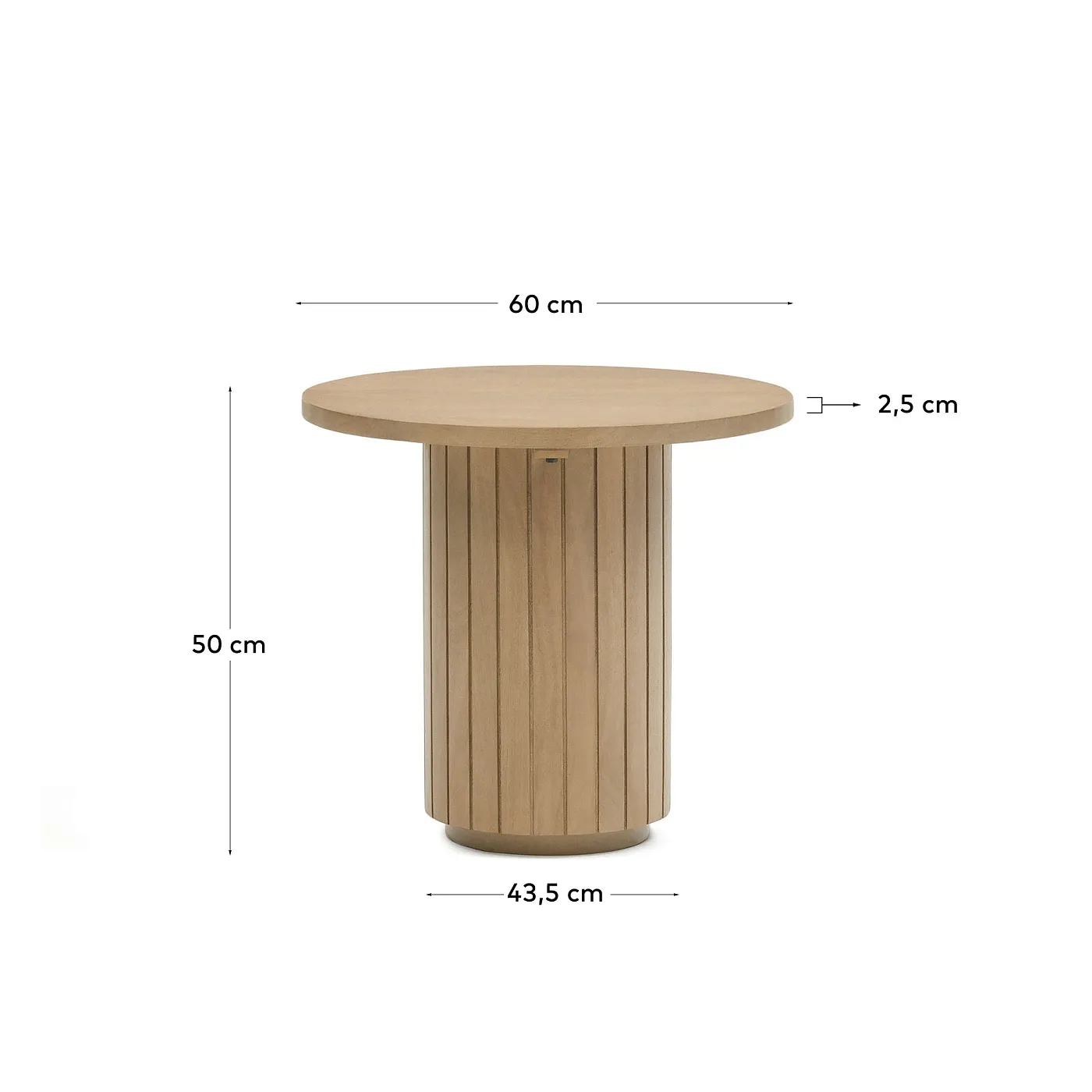 Стол состоит из круглой столешницы и цилиндрической стойки с нижним диаметром 43,5 см. Он полностью сделан из древесины манго. Поверхность покрыта прозрачным лаком, который защищает от влаги, загрязнений, ультрафиолета. Толщина столешницы – 2,5 см. Стойка собрана из реек одинаковой ширины. Тональность каждого элемента уникальная, что делает стол неповторимым. У основания есть пластиковые накладки, которые улучшают устойчивость на неровной поверхности. Максимально допустимая нагрузка на стол не должна превышать 50 кг.