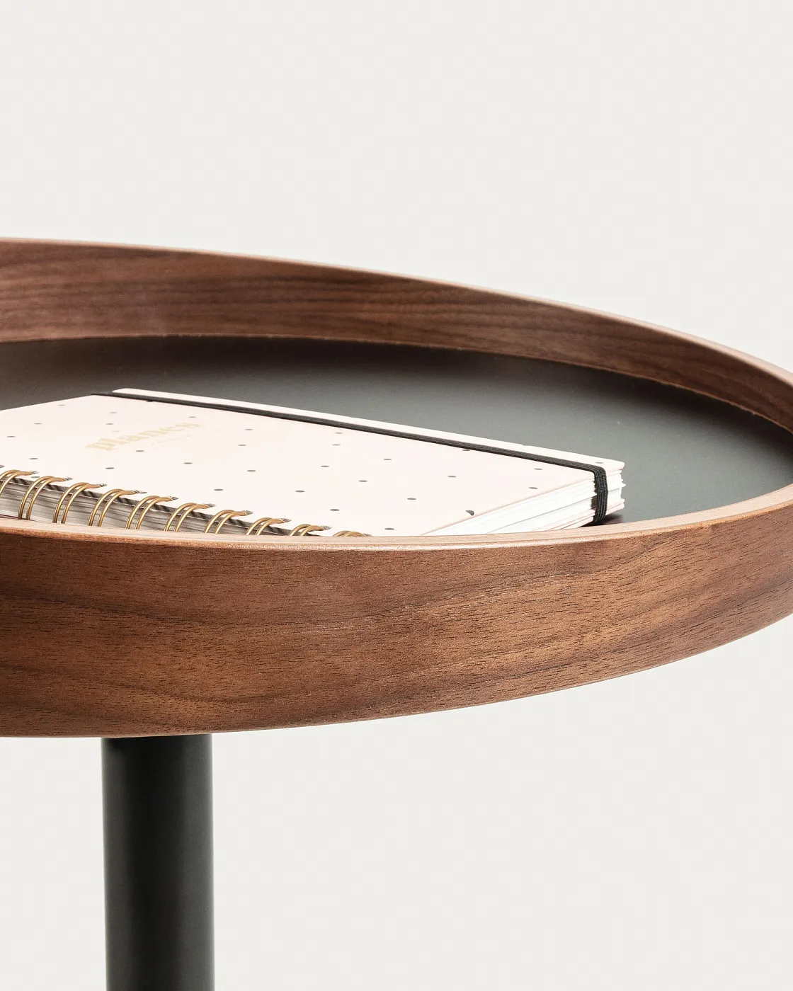 Столик Karlin орех от фабрики La Forma – элегантный дизайн для стильных европейских интерьеров. Столик Karlin станет отличным дополнением к интерьеру в спальне или гостиной, выполненным в стиле европейского модерна. Минималистичный дизайн и актуальный шпон орехового дерева – гарантия того, что эта модель будет сочетаться с любой деревянной современной мебелью. А скошенный бортик – уникальная особенность изделия. Столик круглой формы, сборный. Он состоит из металлической стойки и деревянной столешницы. Бортик выполнен из шпона орехового дерева и достигает в высоту 5 см. Основание сделано из МДФ и покрыто меламином (полимерной пленкой) для защиты от влаги и загрязнений. Удерживает столешницу металлическая стойка (сталь), покрытая черной эпоксидной краской. Дисковое основание диаметром 35 см обеспечивает стойкость на любом напольном покрытии, а цилиндрическая ножка диаметром 4 см гарантирует прочность и надежность при высоких весовых нагрузках (максимально допускается 20 кг). Размеры изделия: диаметр столешницы – 44-46 см (по внутреннему и по внешнему контуру); высота – 51 см. Вес – 4,6 кг. Потребуется небольшая самостоятельная сборка, которая займет не более 10 минут.