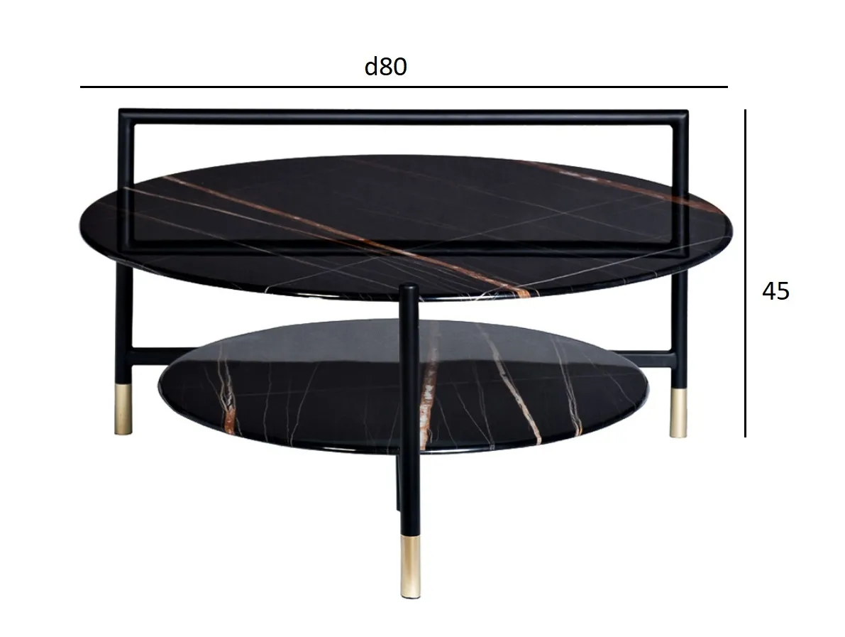 Круглый журнальный столик просто незаменим в любом интерьере. Столешница из прочного закаленного стекла искусно имитирует темный мрамор с яркими цветными прожилками. С такой красивой мебелью оживает любой интерьер. Удобная ручка на столешнице позволяет легко передвинуть стол в нужное место. Изящные золотые наконечники на ножках хорошо сочетаются с темными столешницами, придавая столу особый блеск и красоту. Широкий журнальный столик с полкой – удобный и функциональный предмет мебели, который прекрасно подойдет для гостиной, столовой, спальни или кабинета. Толщина столешниц 8мм.