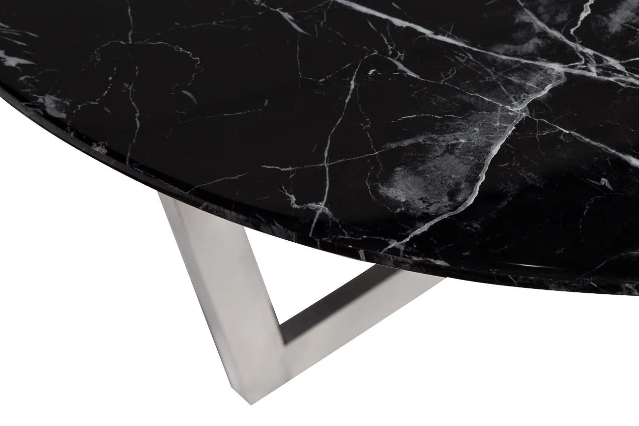 Благородную красоту журнального стола Nero со столешницей из МДФ с мраморным принтом черного цвета с белыми прожилками и основанием из нержавеющей стали цвета матовый хром оценят люди с тонким художественным вкусом. Элегантный дизайн и превосходное качество столика помогут ему органично вписаться как в интерьер кабинета, так и в будуар или гостиную. Толщина столешницы - 25мм.
