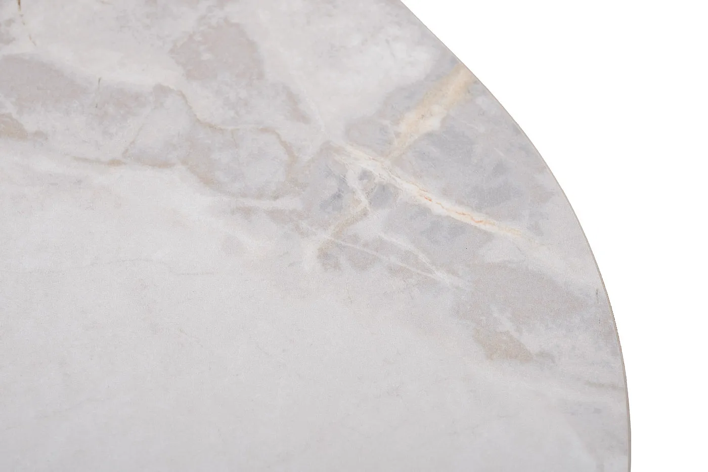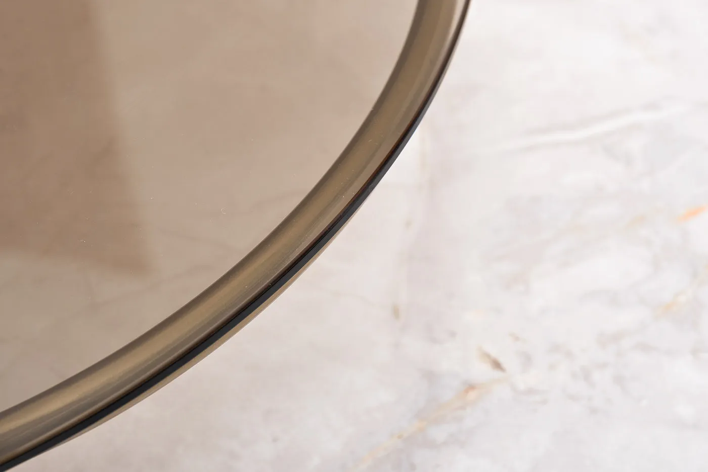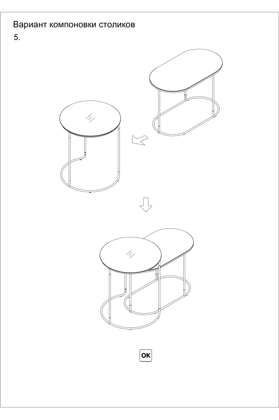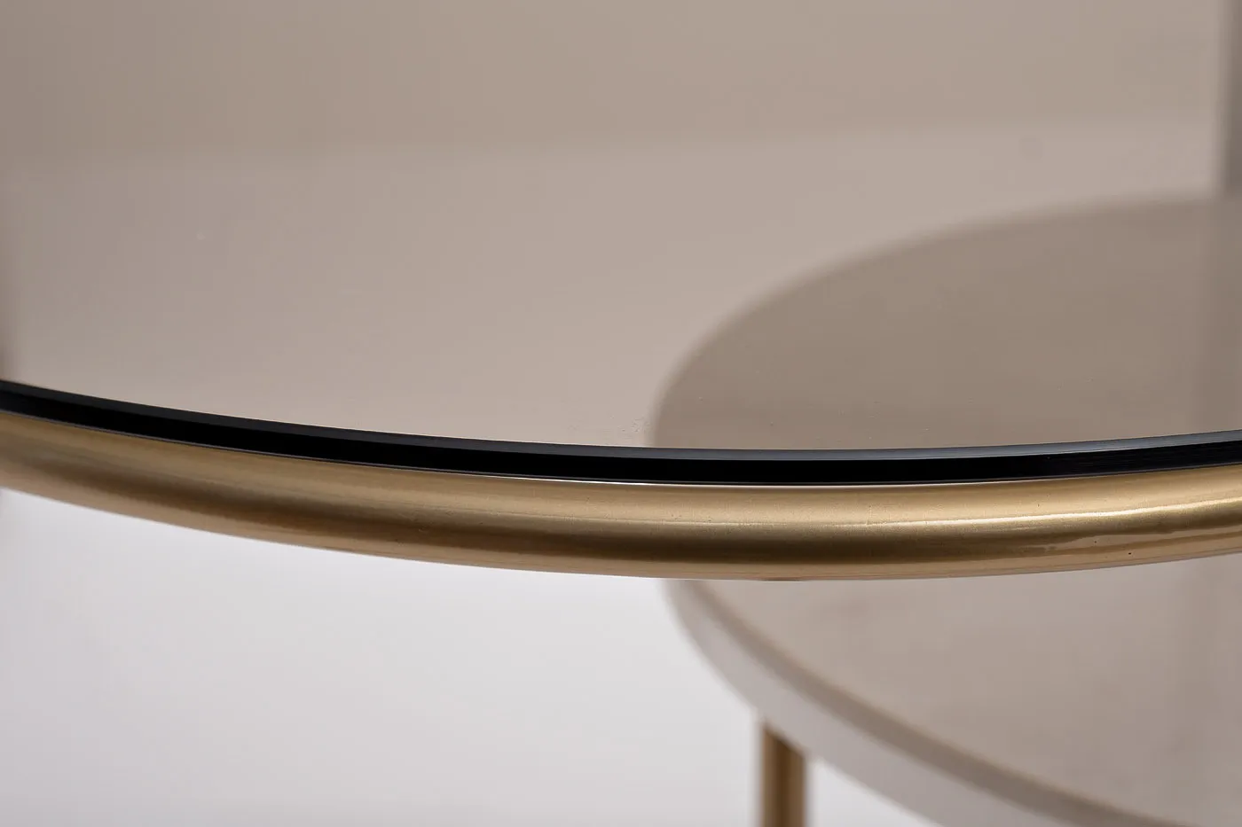 Стильный набор журнальных столов эффектно выглядит в интерьере современной гостиной за счет необычной двойной конструкции. В отличие от традиционного решения, данный комплект журнальных столов более функциональный и вариативный. При необходимости можно получить два столика для сервировки или легко освободить пространство, задвинув овальный стол под круглый. Особенность этой модели – сочетание двух материалов столешниц: закаленного стекла и керамогранита. Две разные фактуры объединяет одинаковое основание из нержавеющей стали с позолотой. За счет такого дизайнерского подхода набор смотрится гармонично и весьма эффектно.