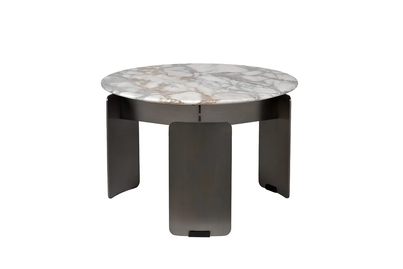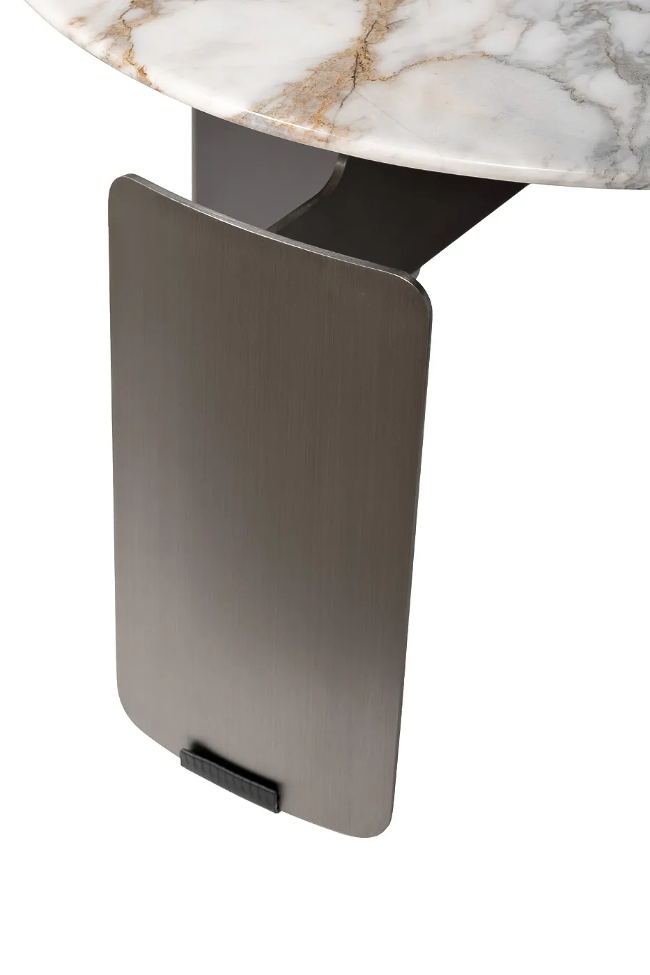 Небольшой стол из глянцевого природного мрамора Arabescato Corchia на трех опорах из нержавеющей стали. Каждая столешница имеет уникальный узор, состоящий преимущественно из белого с узором из серых и желтовато-охристых включений. Толщина столешницы - 18мм. Для защиты столешницы от царапин необходимо пользоваться салфетками или мягкими подставками.