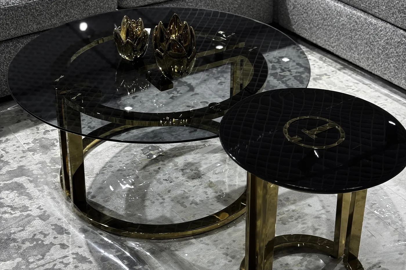 Элегантный журнальный столик из коллекции D’Oro, созданной дизайнерами Garda Design Studio. Небольшой столик с основанием из полированной стали золотистого цвета и столешницей из натурального камня под мрамор сделает ваш интерьер стильным и роскошным. Оригинальный дизайн, декоративные элементы золотого цвета в виде логотипа "GD" - Garda Decor, качественные материалы - вот что отличает эту линейку дизайнерской мебели!