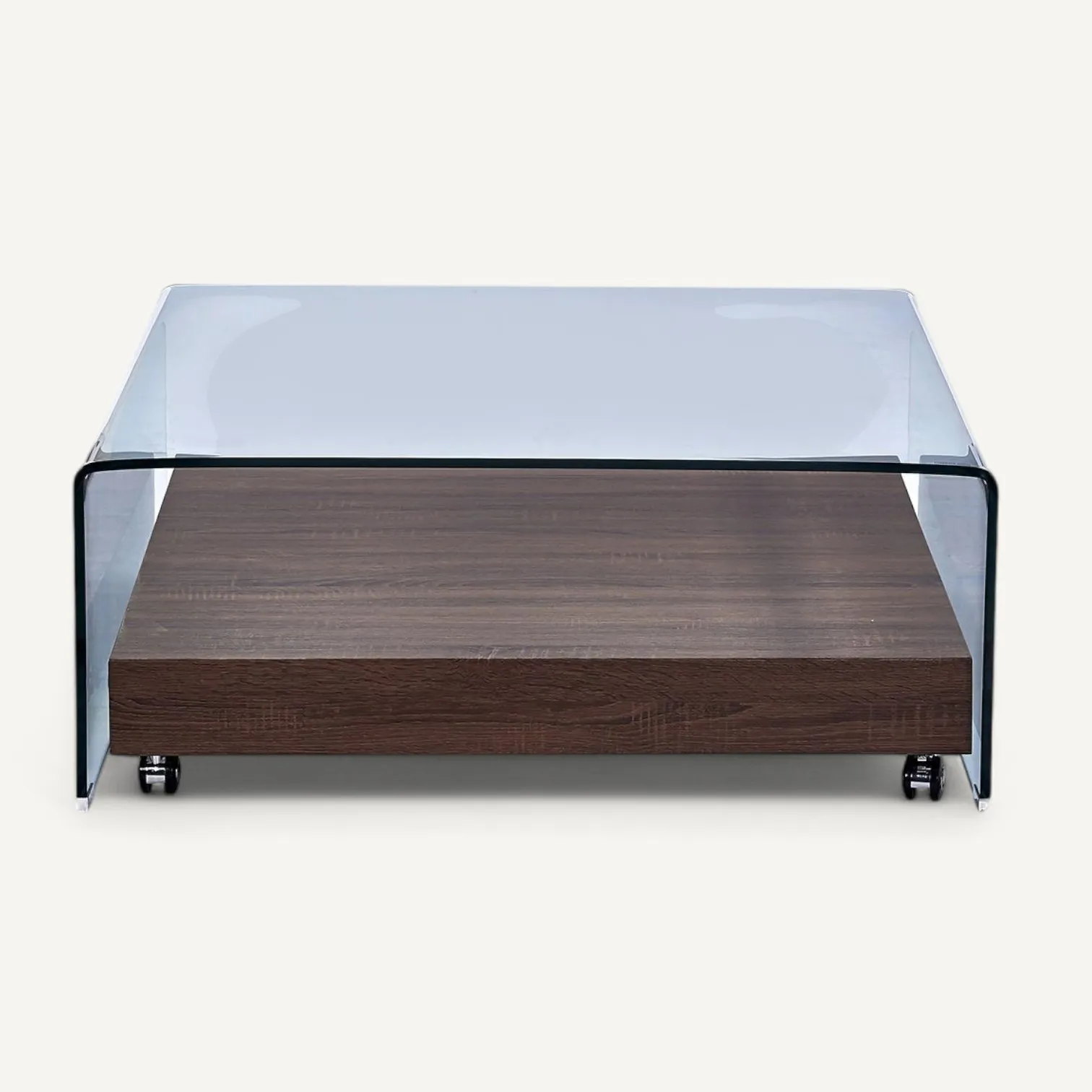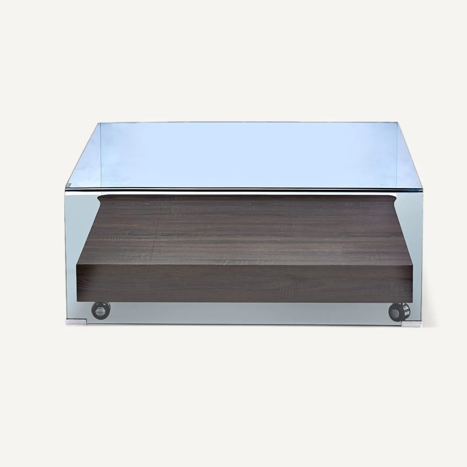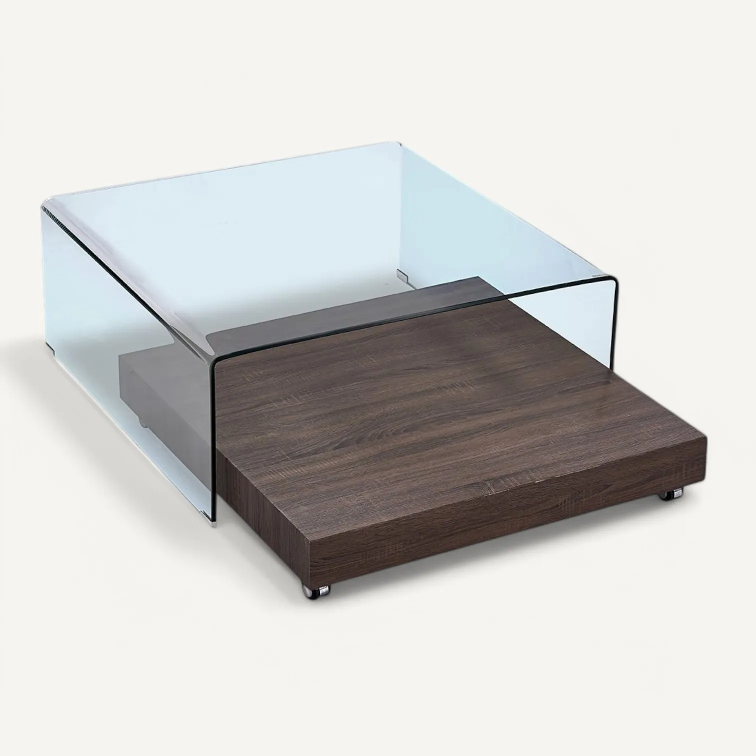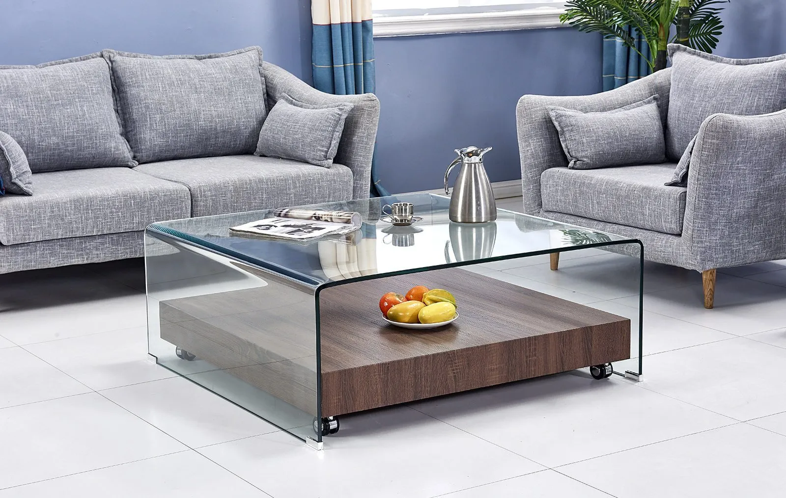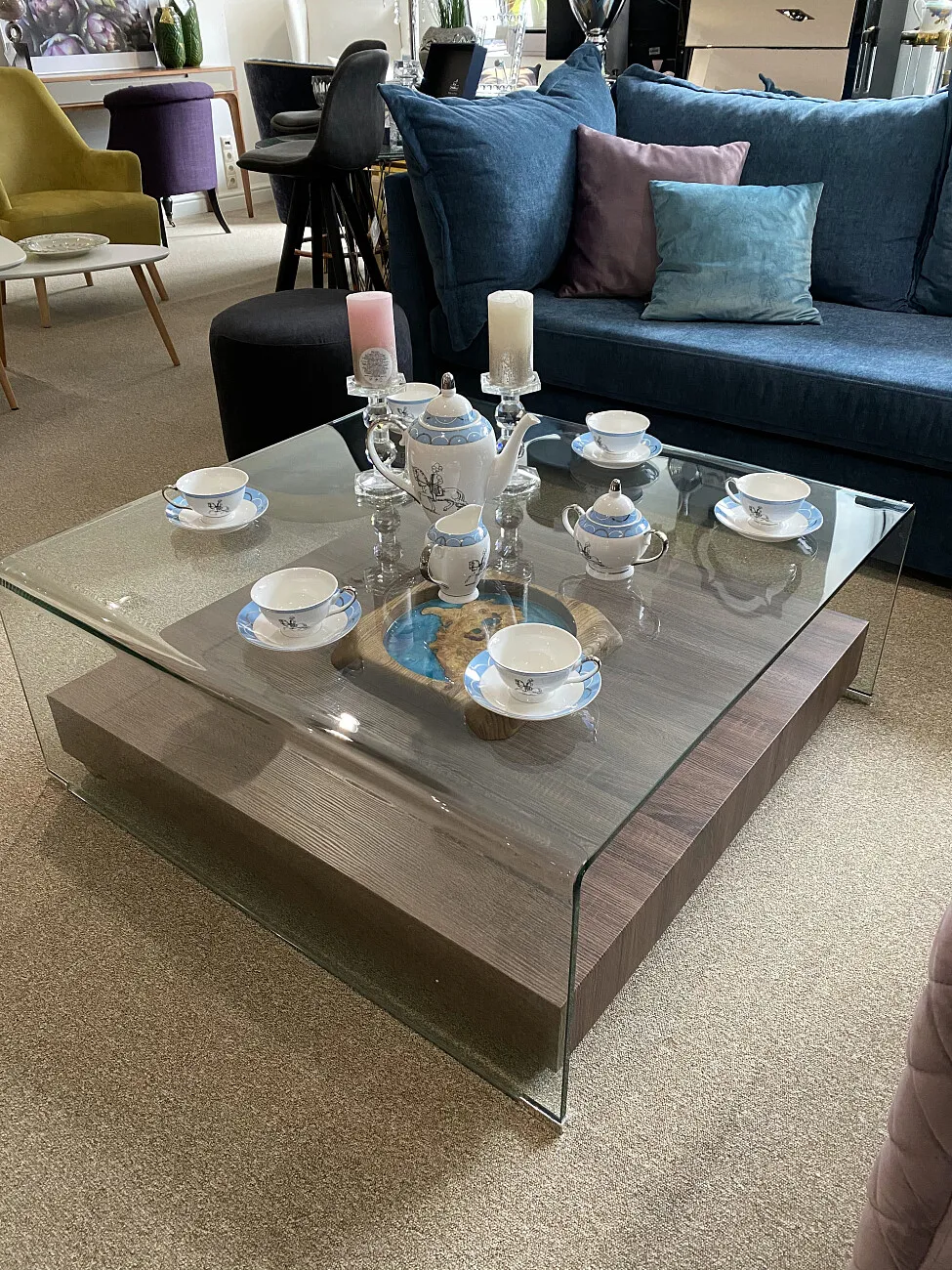 Модель имеет прочное основание из массива бука, к которому крепится стеклянная столешница с боковыми стенками толщиной 12 мм.