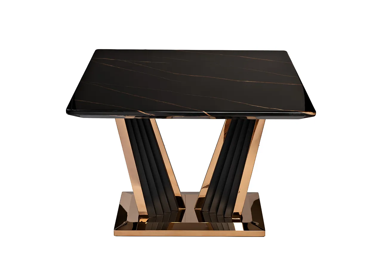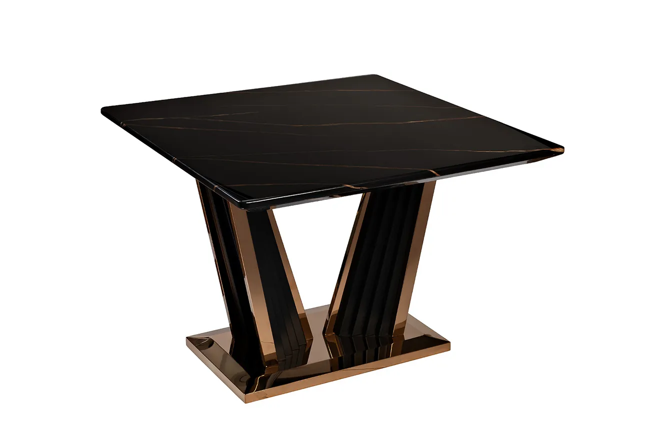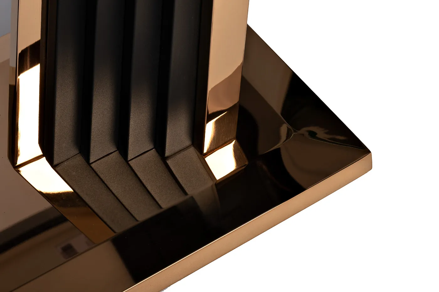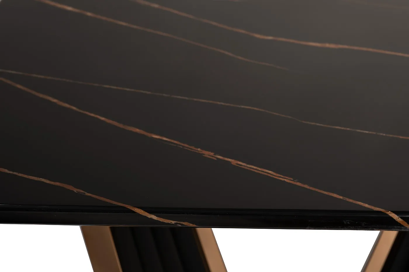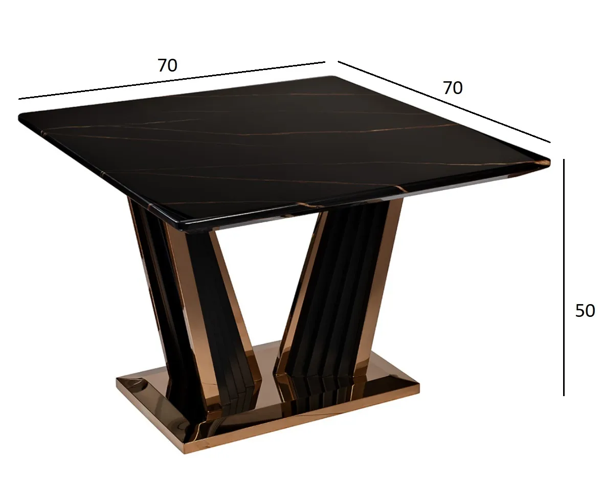 Кофейный стол, задача которого украшать, вдохновлять и радовать глаз. Не ждите от него универсальности и простоты – это не про данную модель. Этот дизайнерский стол воплощает в себе высокий стиль и роскошную элегантность. Аристократичный черный цвет столешницы и блеск металла красноречиво подчеркивают достоинство этой мебели. Столик эффектно будет смотреться в гостиной, оформленной в стиле ар-деко или неоклассика. Предлагаем купить журнальный кофейный стол премиального качества для декора жилых и статусных бизнес-интерьеров. Столешница - природный камень с полимерным покрытием под мрамор на подстолье из МДФ