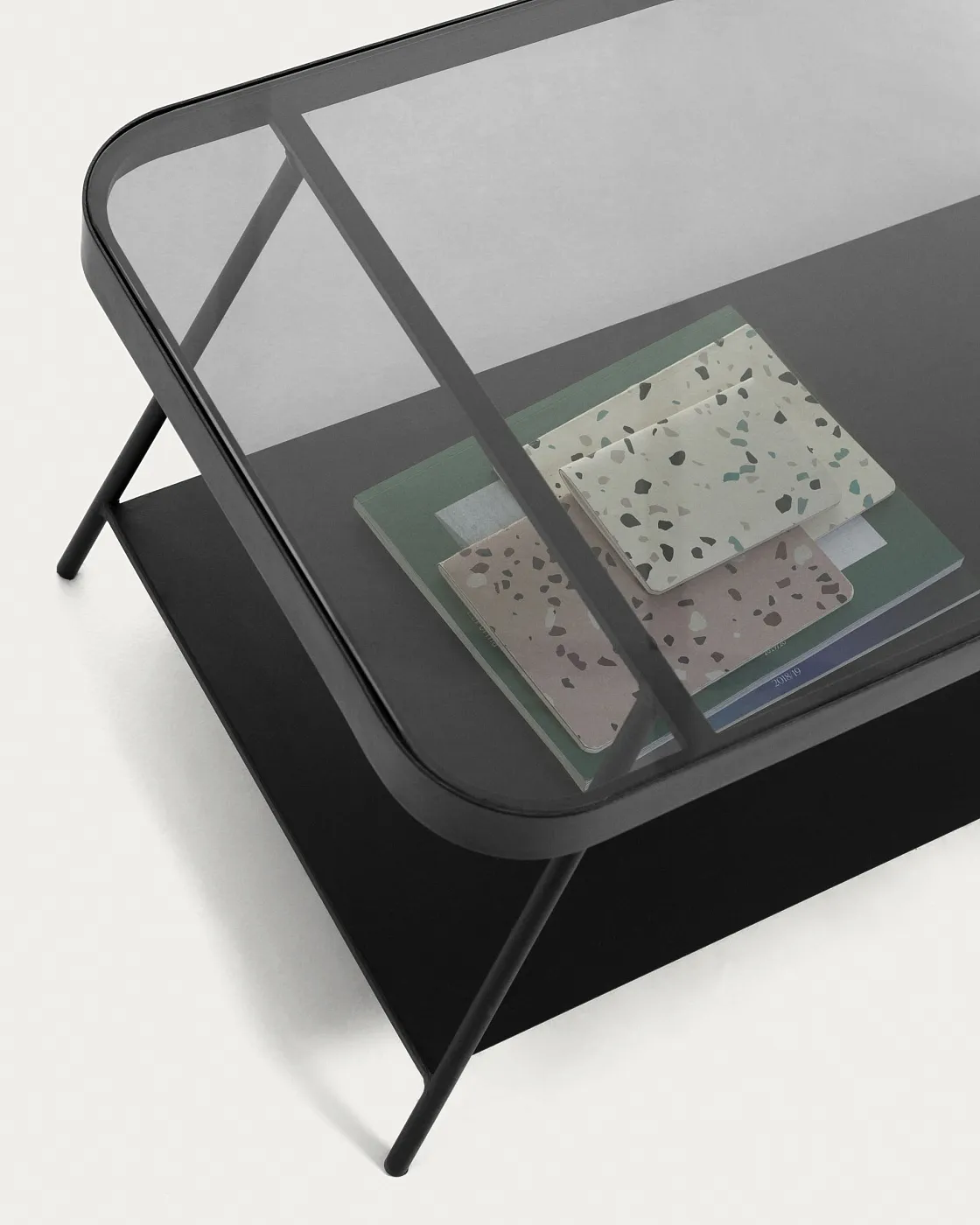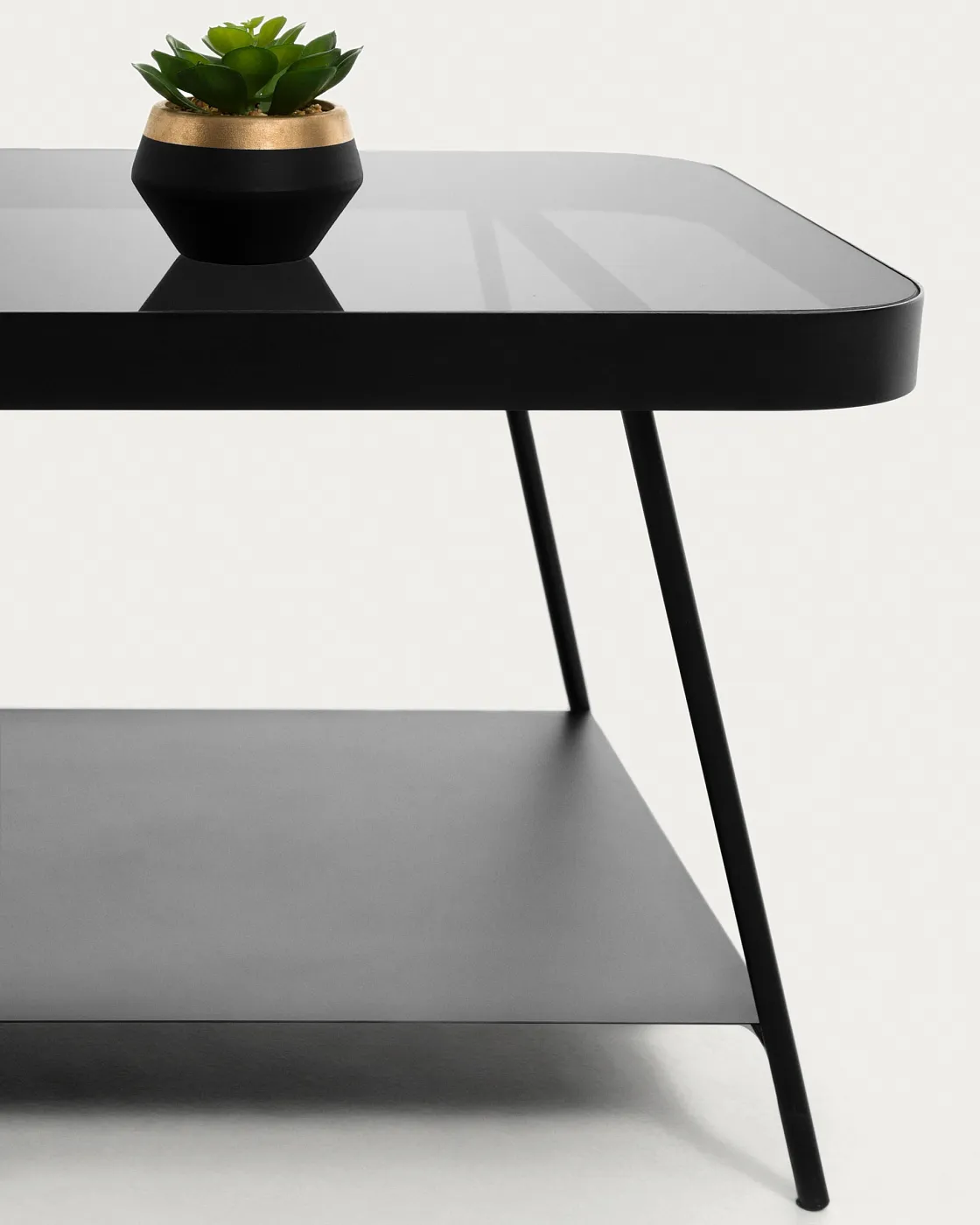 Столик журнальный Duilia от фабрики La Forma – промышленный минимализм с обтекаемой столешницей. Журнальный столик Duilia несомненно полюбят за его современный дизайн и продуманную эргономику. Здесь много места за счет наличия нижнего яруса, а стеклянная столешница благодаря обтекаемой форме окантовки полностью безопасна и удобна в эксплуатации. Стол трапециевидный, двухъярусный. Столешница стеклянная, ударопрочная. Стекло находится в металлической раме обтекаемой формы высотой 4 см. Удерживают столешницу две рамочные опоры, расставленные под углом. Толщина каждой ножки составляет 1,3 см. Нижняя полка металлическая. Она находится на высоте 8 см от пола. Ее габариты – 40 х 82 см. Все металлические элементы покрыты черной порошковой краской. Максимальная нагрузка на стол не должна превышать 20 кг. Размеры: ширина – 90 см, глубина – 45 см, высота – 40 см. Вес – 13.95 кг. Сборка не требуется.