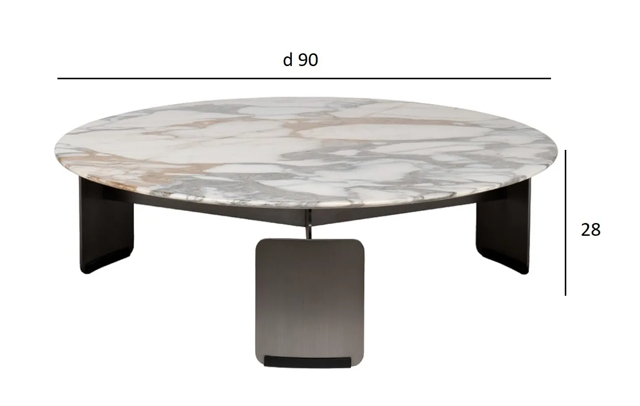 Невысокий стол из глянцевого природного мрамора Arabescato Corchia на трех опорах из нержавеющей стали. Каждая столешница имеет уникальный узор, состоящий преимущественно из белого с узором из серых и желтовато-охристых включений. Толщина столешницы - 18мм. Для защиты столешницы от царапин необходимо пользоваться салфетками или мягкими подставками.