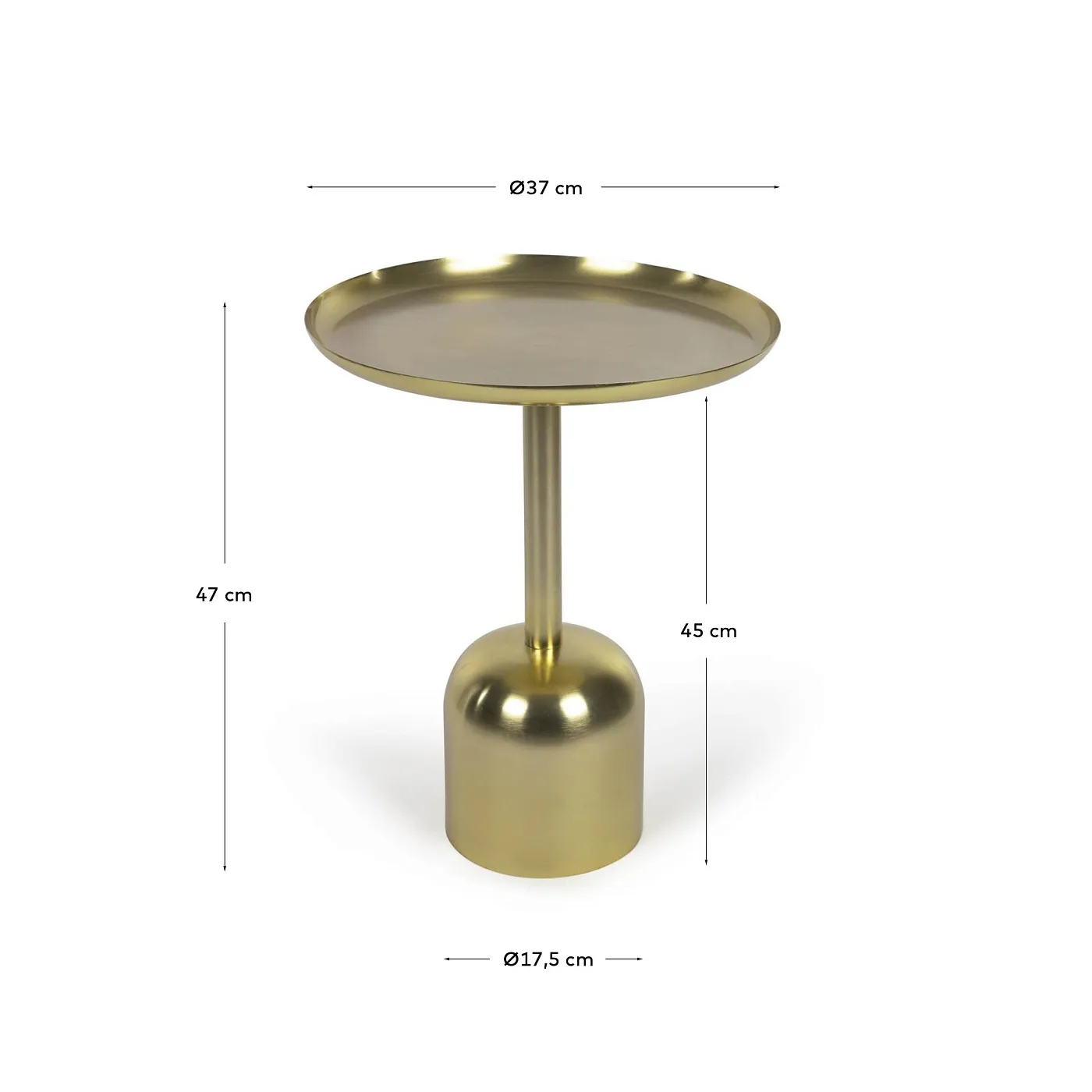Приставной столик Adaluz от фабрики La Forma (ex Julia Grup) – легкая конструкция в золотой отделке. Приставной столик Adaluz – отличный способ разнообразить домашнюю обстановку с пользой. Его небольшие габариты и круглая форма прекрасно впишутся даже в самое компактное помещение. А сверкающая позолота создаст яркий акцент в дизайне. Дополнив стол парой чашек с кофе или бокалами с вином, он поспособствует приятной беседе. Пользуйтесь этим предметом так, как сочтете нужным! Приставной столик полностью сделан из металла, окрашен в золотой цвет гальванической краской. Технология порошкового нанесения обеспечивает идеально гладкую поверхность, что способствует более яркому блеску металла. Круглое основание диаметром 17,5 см обеспечивает устойчивость на любом напольном покрытии. Еще один плюс в дизайне – поднятые вверх края столешницы, которые не дадут пролиться жидкости на пол. Высота бортиков – 2 см. Размеры: ширина – 37 см, высота – 47 см, глубина – 37 см. Вес изделия – 2,6 кг. Сборка не требуется. Только для эксплуатации в помещении.
