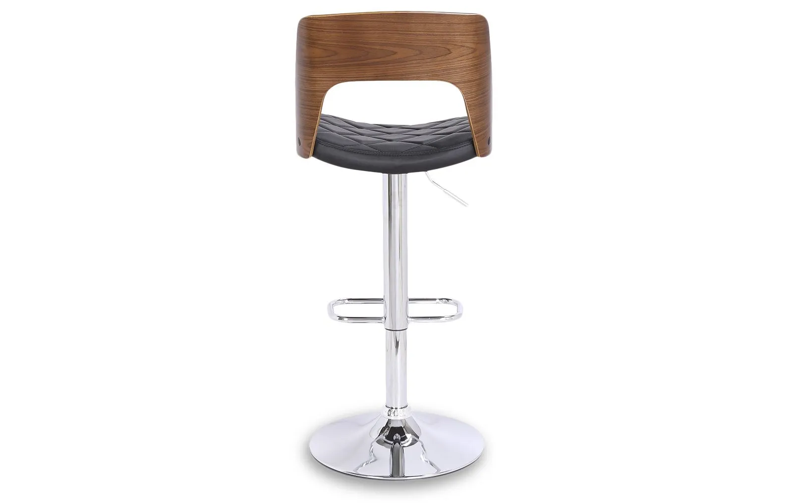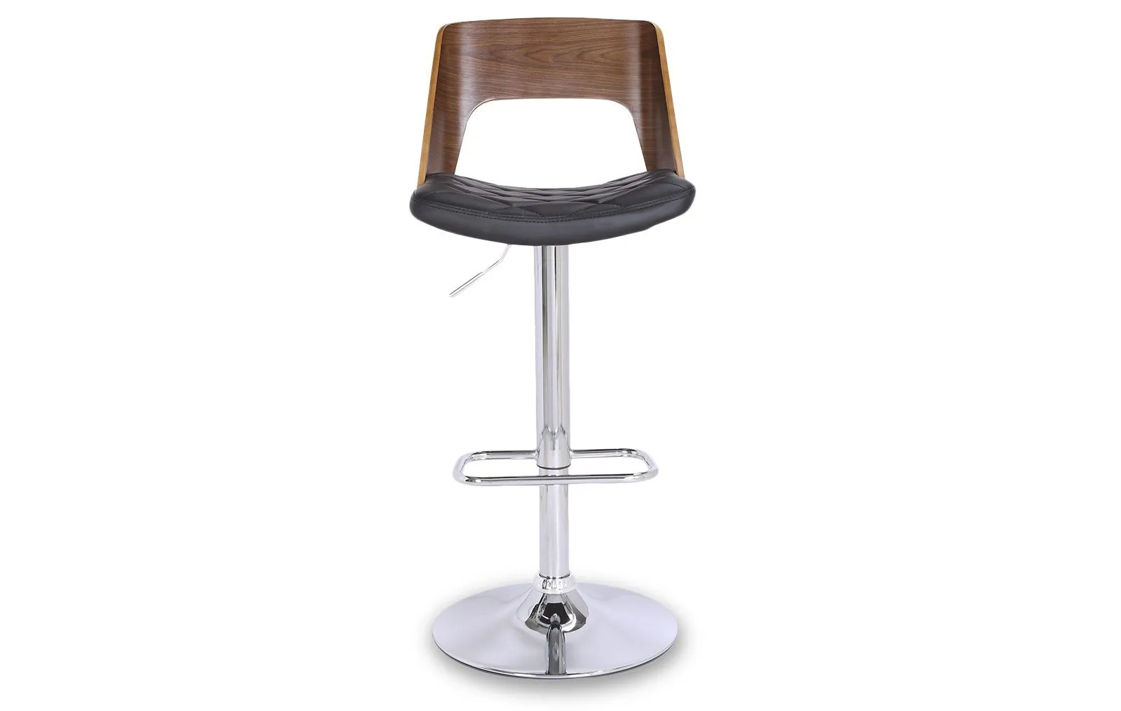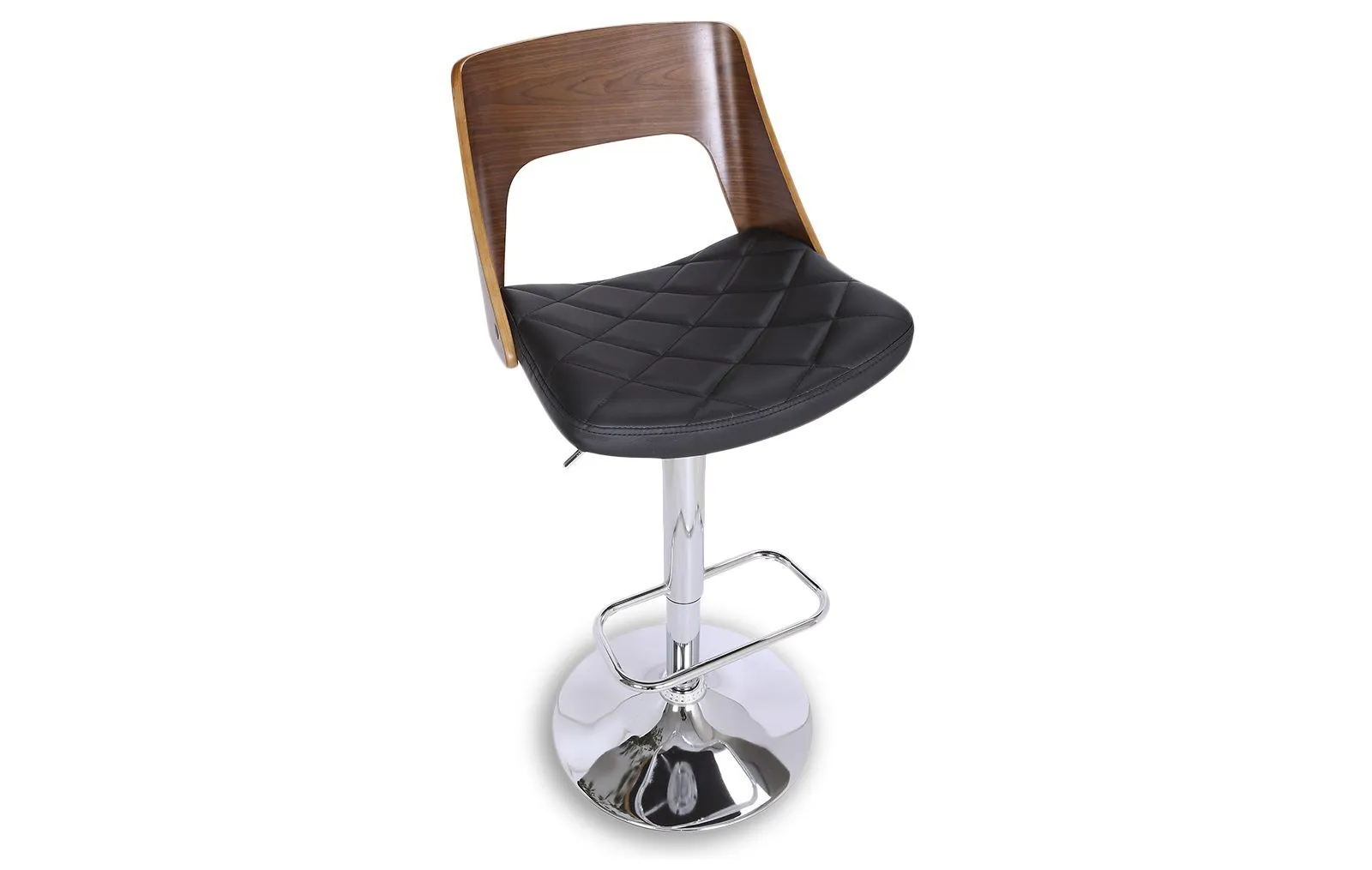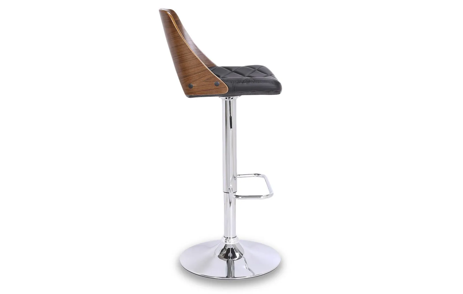 Сиденье выполнено из гладкой экокожи и шпона ореха, ножка из хромированного металла
