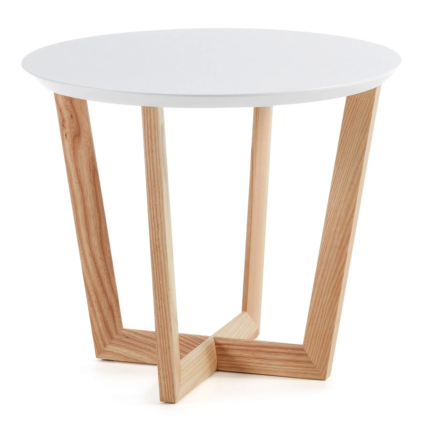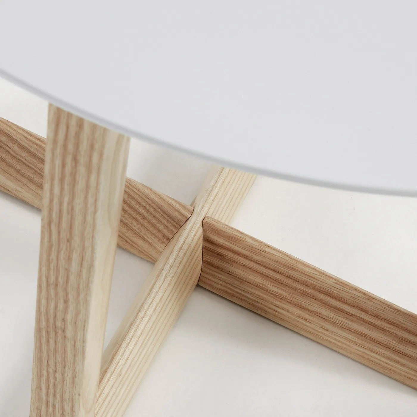 Круглый приставной столик с деревянной основой из ясеня и матовой белой столешницей.