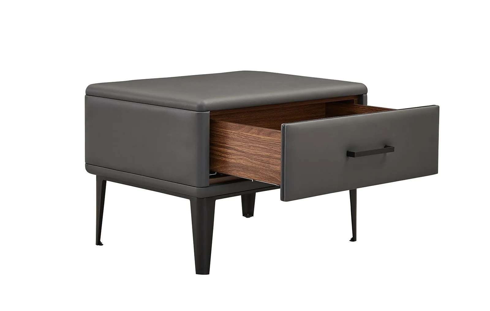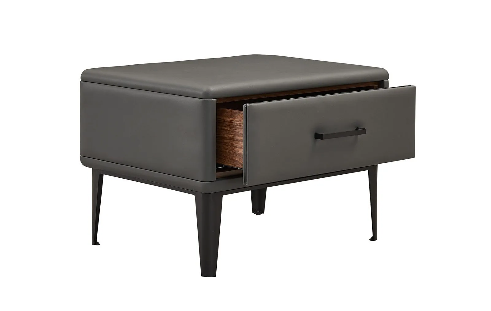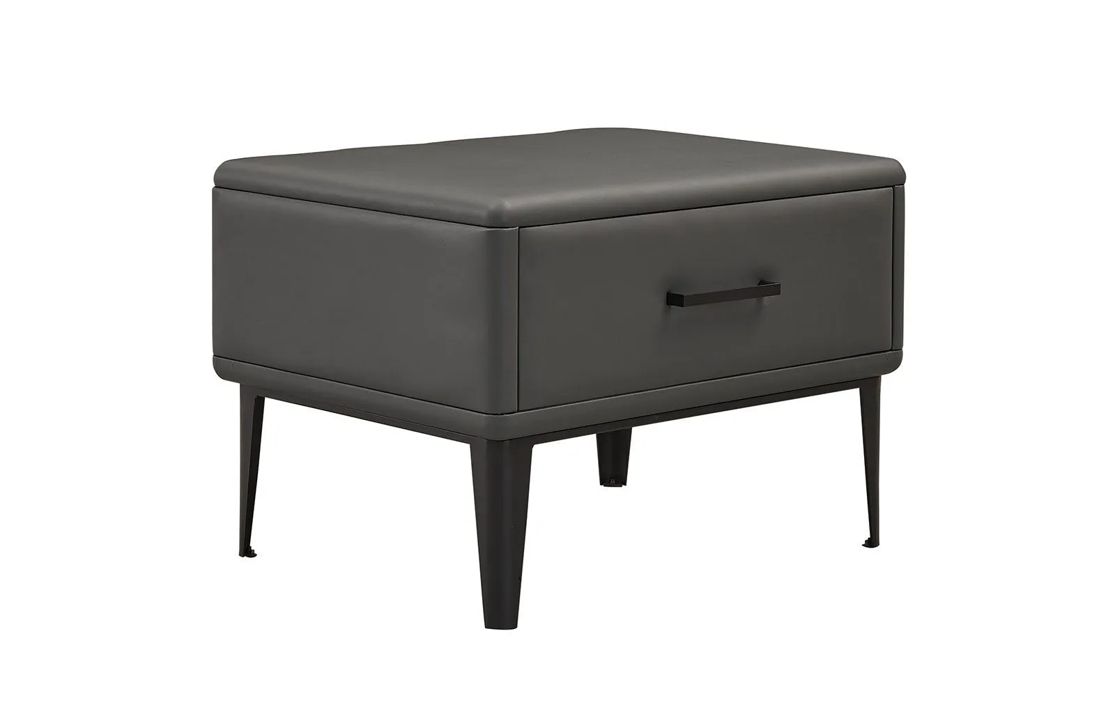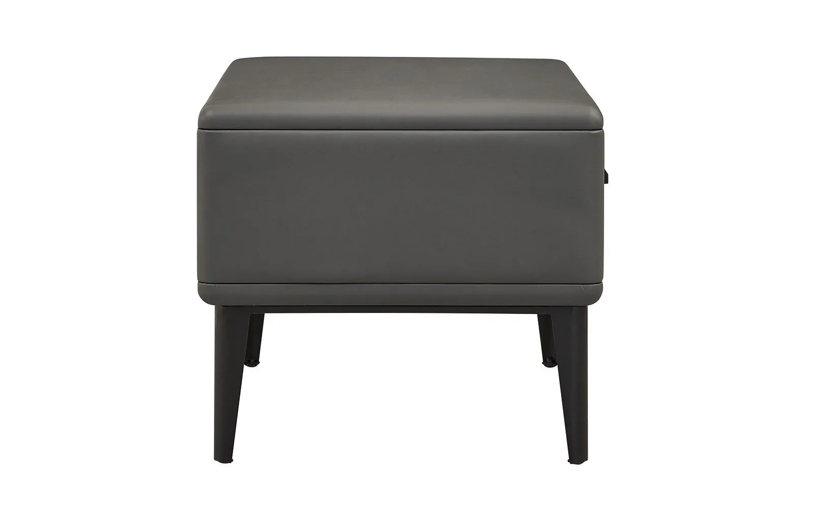 Ножки тумбочки выполнены из металла, что добавляет не только крепости, но и современного стиля. Материал обивки представлен высококачественной экокожей, что обеспечивает эстетичный внешний вид и легкий уход.