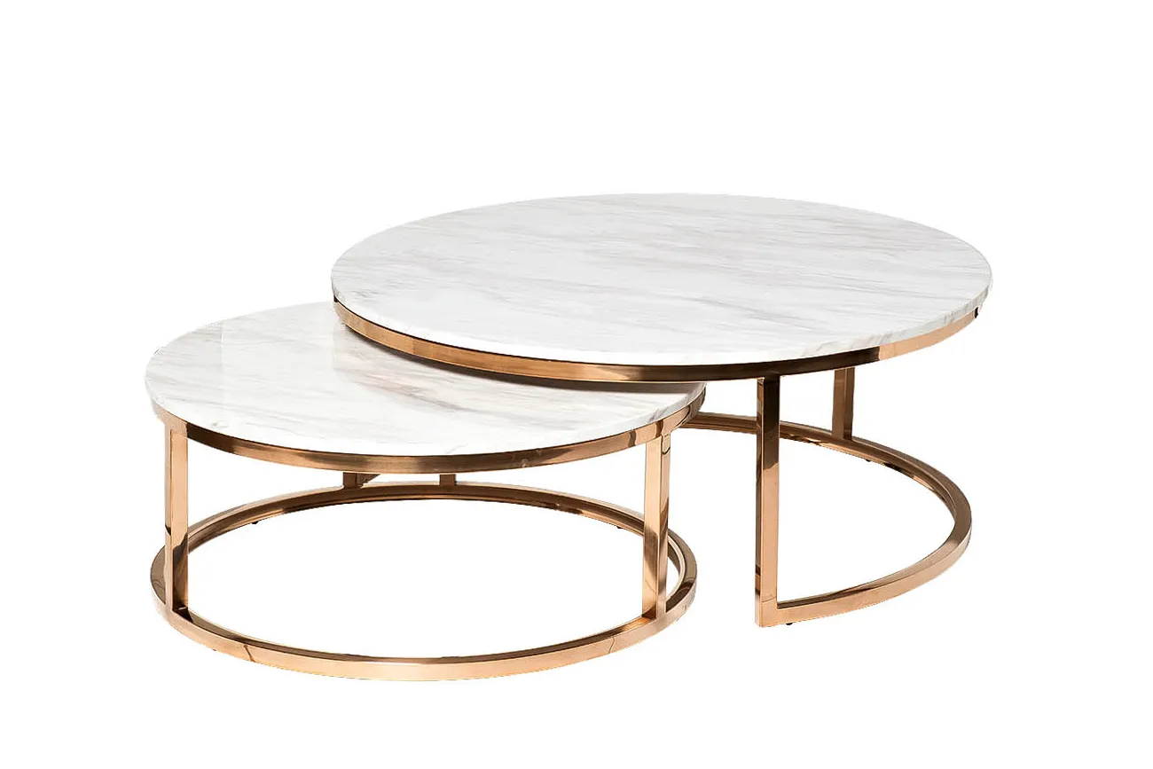 Комплект журнальных столов для гостиной – удачный выбор для посиделок с друзьями или семьей. Предметы сделаны по принципу матрешек. Эти круглые журнальные столы немного различаются размерами. В результате один из них удобно задвигается под другой, экономя пространство. При необходимости столики можно раздвинуть, если у вас намечаются гости. Такой набор журнальных столов выглядит необычайно стильно и презентабельно. Мебель выполнена со вкусом, отвечает современным требованиям качества. В состав входит нержавеющая сталь и искусственный мрамор.