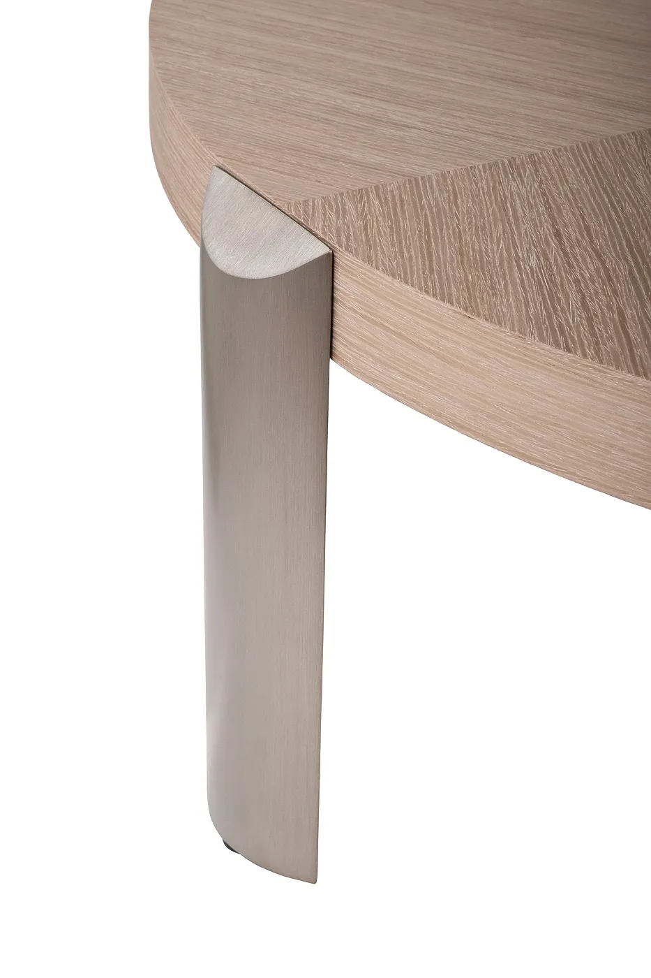 Элегантный журнальный столик с низкой круглой столешницей станет изысканным дополнением гостиной или холла. Столешница выполнена из МДФ, отделанного светлым шпоном с красивым рисунком древесины. Опоры столика, выполненные из металла цвета матового серебра, придают ему утонченный и современный вид.