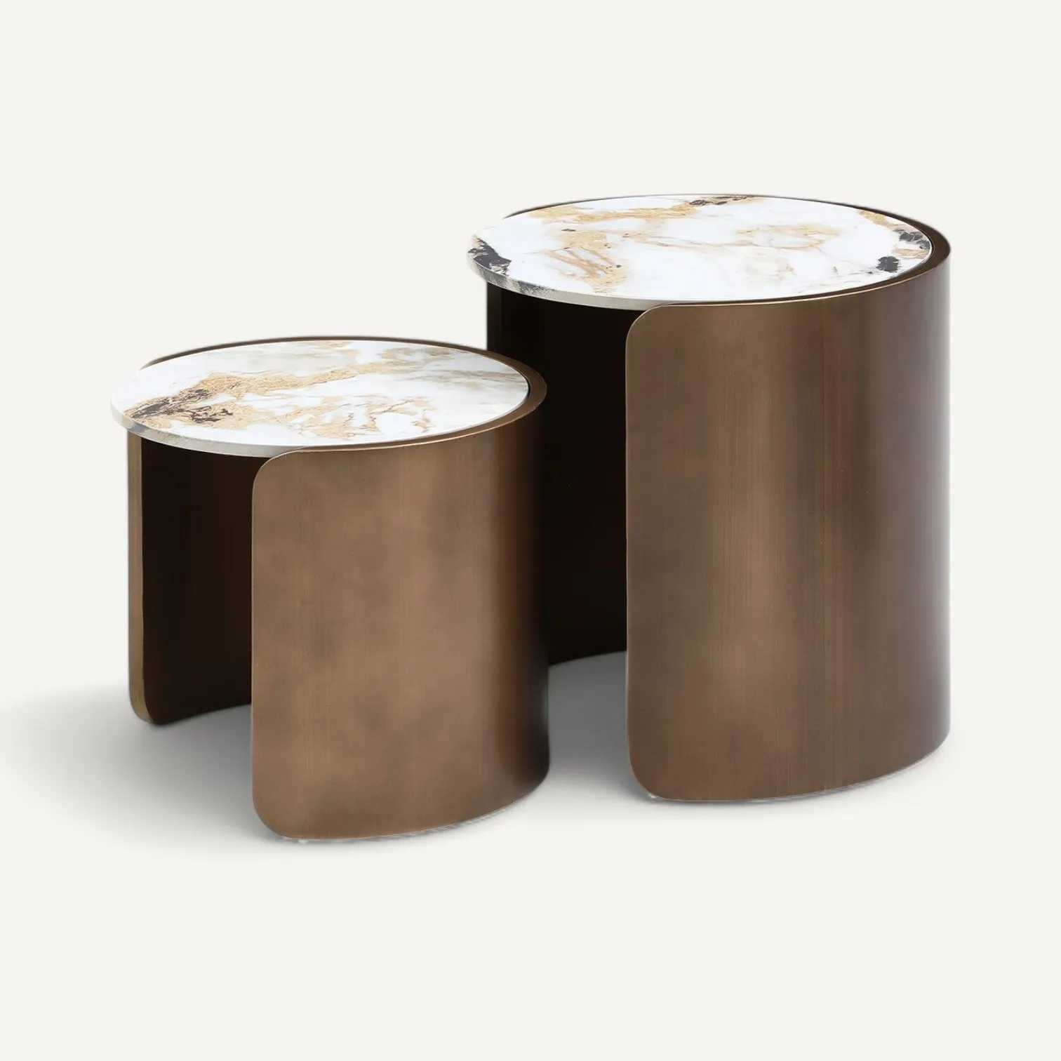 Композиция из двух журнальных столиков Bliss различного диаметра и высоты, настоящий пример современной роскоши и стиля, 12ти миллиметровая керамическая столешница с уникальным мраморным рисунком плавно переходит в матовое бронзовое основание. Изделия можно удачно гармонировать между собой, а можно смело использовать по отдельности, как в гостиной и лаунж-зоне, так и в качестве прикроватного столика, они органично дополнят концепцию современных интерьеров в различных стилистиках.