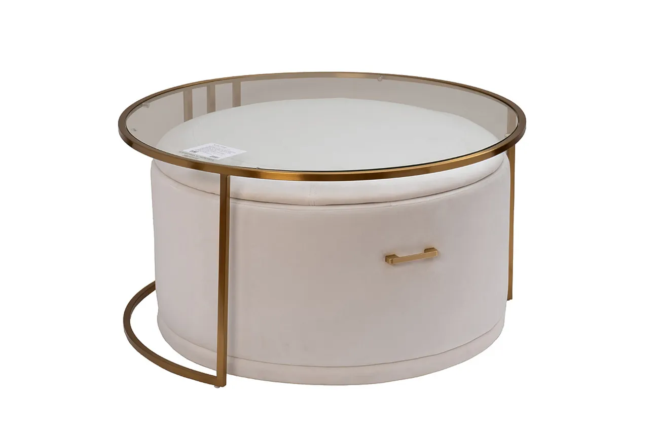 Журнальный стол с пуфом – интересная мебель с эффектным дизайном и расширенным функционалом. Круглый журнальный столик сочетает в себе надежный каркас из блестящей нержавеющей стали и прозрачную столешницу из закаленного стекла. Он составит отличную компанию диванам и креслам, станет эффектным дополнением к обстановке гостиной. Мягкий светлый пуф из велюра является не только дополнительным местом для сидения, но и удобным способом хранения вещей за счет внутреннего пространства.