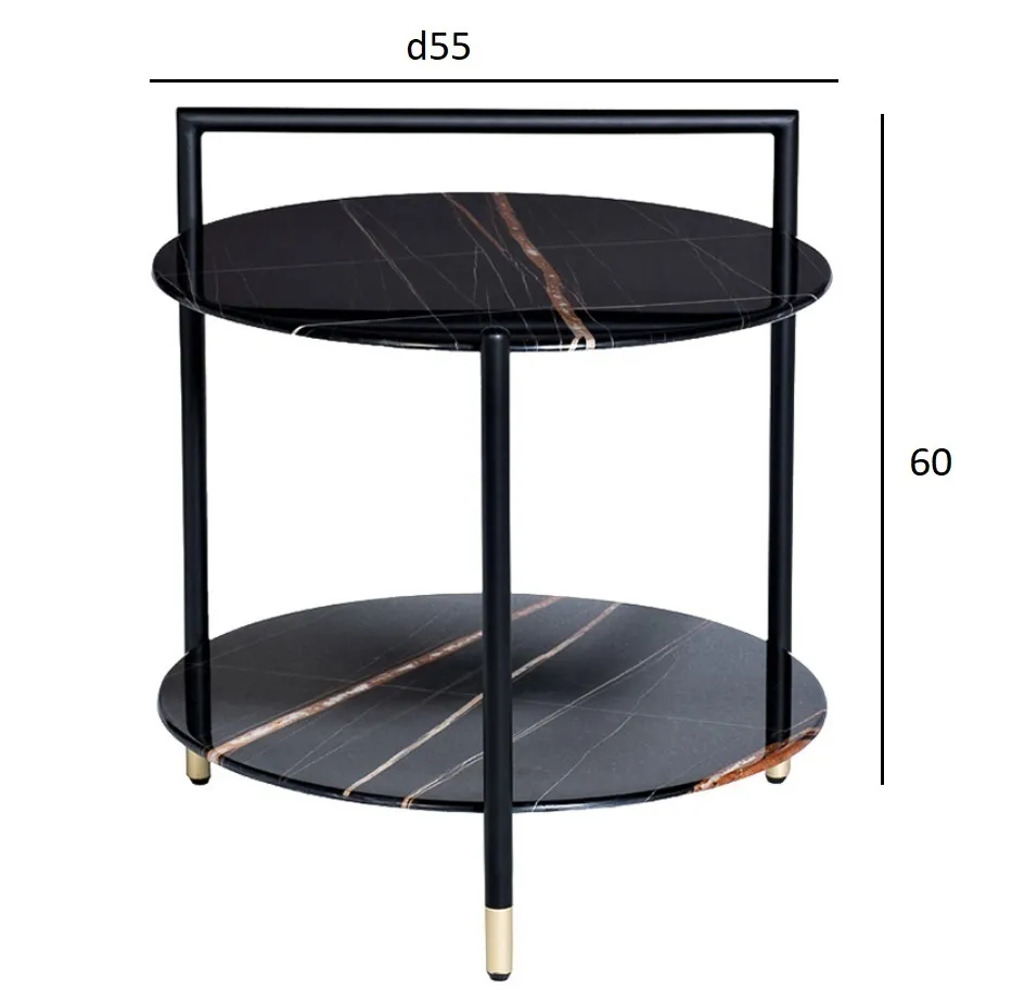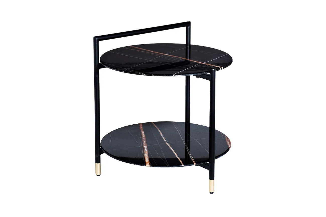 Черный журнальный столик с двумя круглыми столешницами превосходно смотрится в интерьере ар-деко, шебби-шик, современная классика. Он сочетает в себе высокий функционал, практичность и элегантность. Простая лаконичная форма и компактные габариты конструкции позволяют использовать журнальный столик с полкой в комнате любых размеров и назначения. Особенного шика мебели придают блеск закаленного стекла с интересным рисунком и золотые наконечники на тонких ножках.